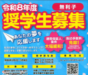 2025年11月25日 / 最終更新日 : 2025年11月25日 管理者 令和8年度 新規奨学生募集のお知らせ 令和8年度 奨学金貸与生募集について以下に案内します。 申込書及び推薦書は 各種様式ー>申込、募集要項 等 ココから 令和8年度募集要項はこちらです。
