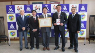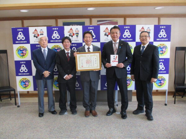 当会代表理事の花城大輔沖縄市長より感謝状が贈呈され、「貴重なご浄財を今後の人材育成に活かしていきたい」と感謝の言葉を述べました。本市からは兼本正人教育部長、本会からは喜友名朝教業務執行理事が同席いたしております。