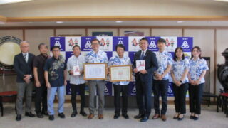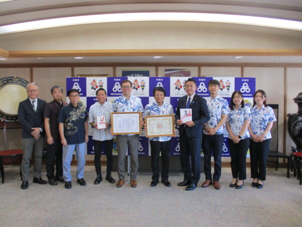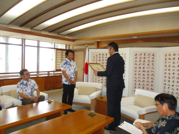 当会代表理事の花城大輔沖縄市長より感謝状が贈呈され、「貴重なご浄財を今後の人材育成に活かしていきたい」と感謝の言葉を述べました。本市からは高江洲実教育長、本会からは金城和彦事務局長が同席いたしております。
