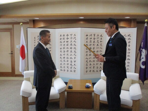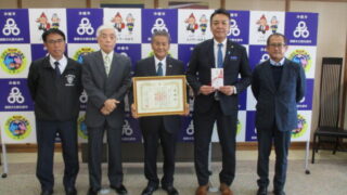 同日に感謝状の贈呈式が執り行われ、会を代表して会長の島袋さまより「青少年育成の一環として寄付しました」とごあいさつを述べられました。当日は事務局長の比嘉剛さまもご同席頂きました。