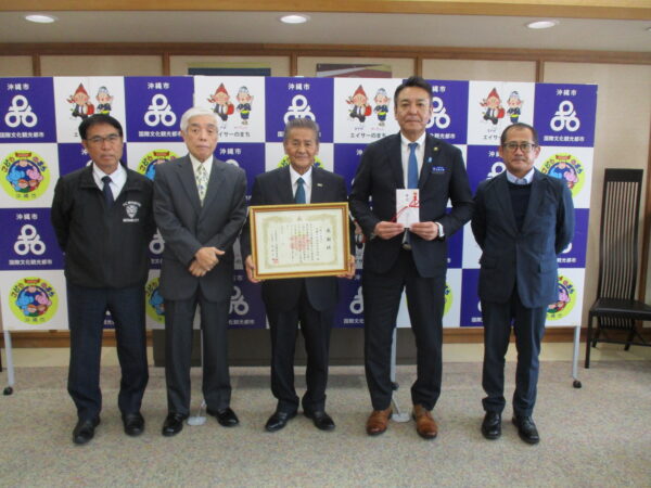 当会代表理事の花城大輔沖縄市長より感謝状が贈呈され、「貴重なご浄財を今後の人材育成に活かしていきたい」と感謝の言葉を述べました。本市からは高江洲実教育長、本会会からは喜友名朝教業務執行理事が同席いたしました。